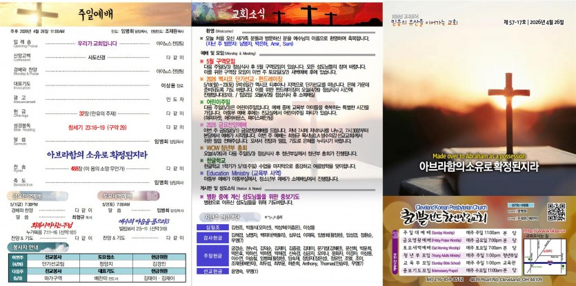 다음 주일(5/3) 점심식사 후 5월 구역모임이 있습니다. 모든 성도님들의 참여 바랍니다.