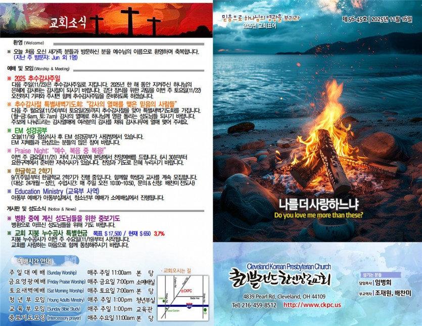 (월~금:6am,토:7am) 감사의 열매로 하나님께 영광 돌리는 성도님들 되시기 바랍니다.