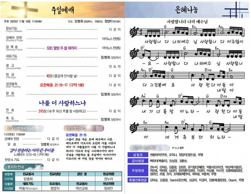 다음 주일(11/23)은 추수감사주일로 지킵니다. 2025년 한 해 동안 지켜주신 하나님의