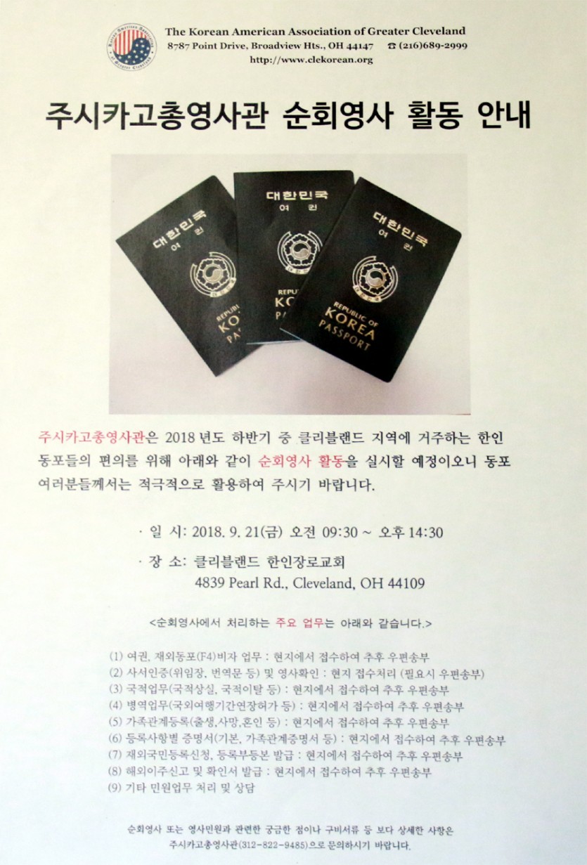 * 순회영사 일정 및 민원 문의 : 주시카고총영사관(312-822-9485)