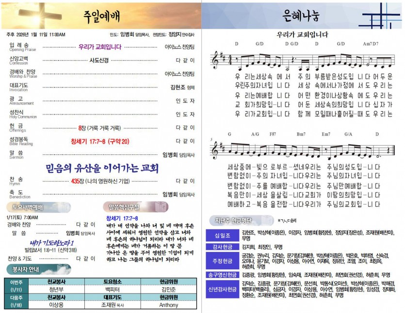 오늘(1/11) 예배 후 2026년 공동의회가 있습니다. 한 해를 계획하고 성도님들의 의견을