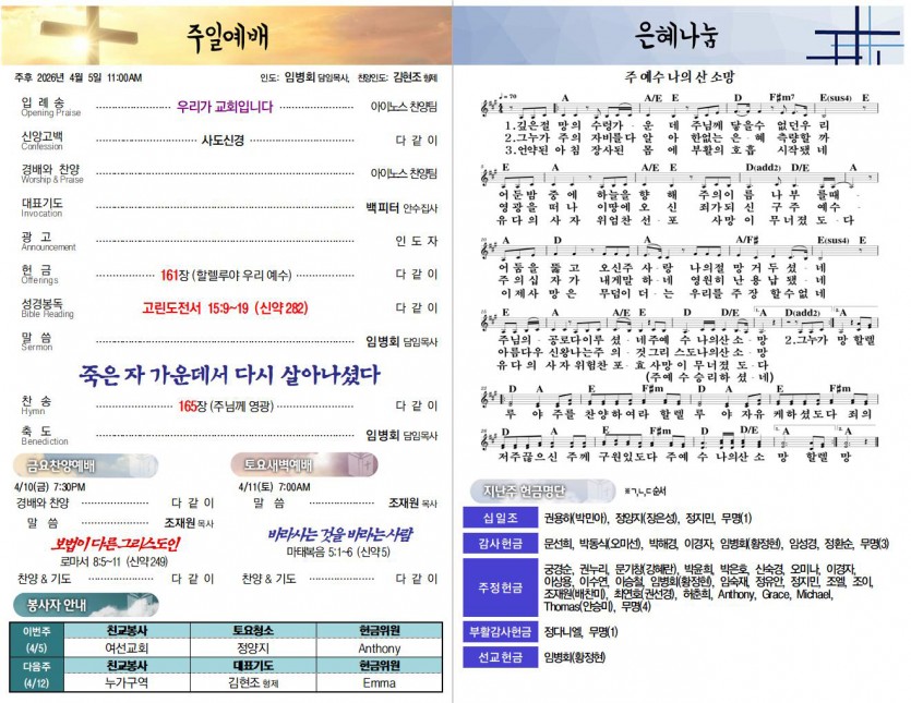 ※ 출타: 임병회 담임목사 (한국 순천남노회 MOU: 4/6~18)